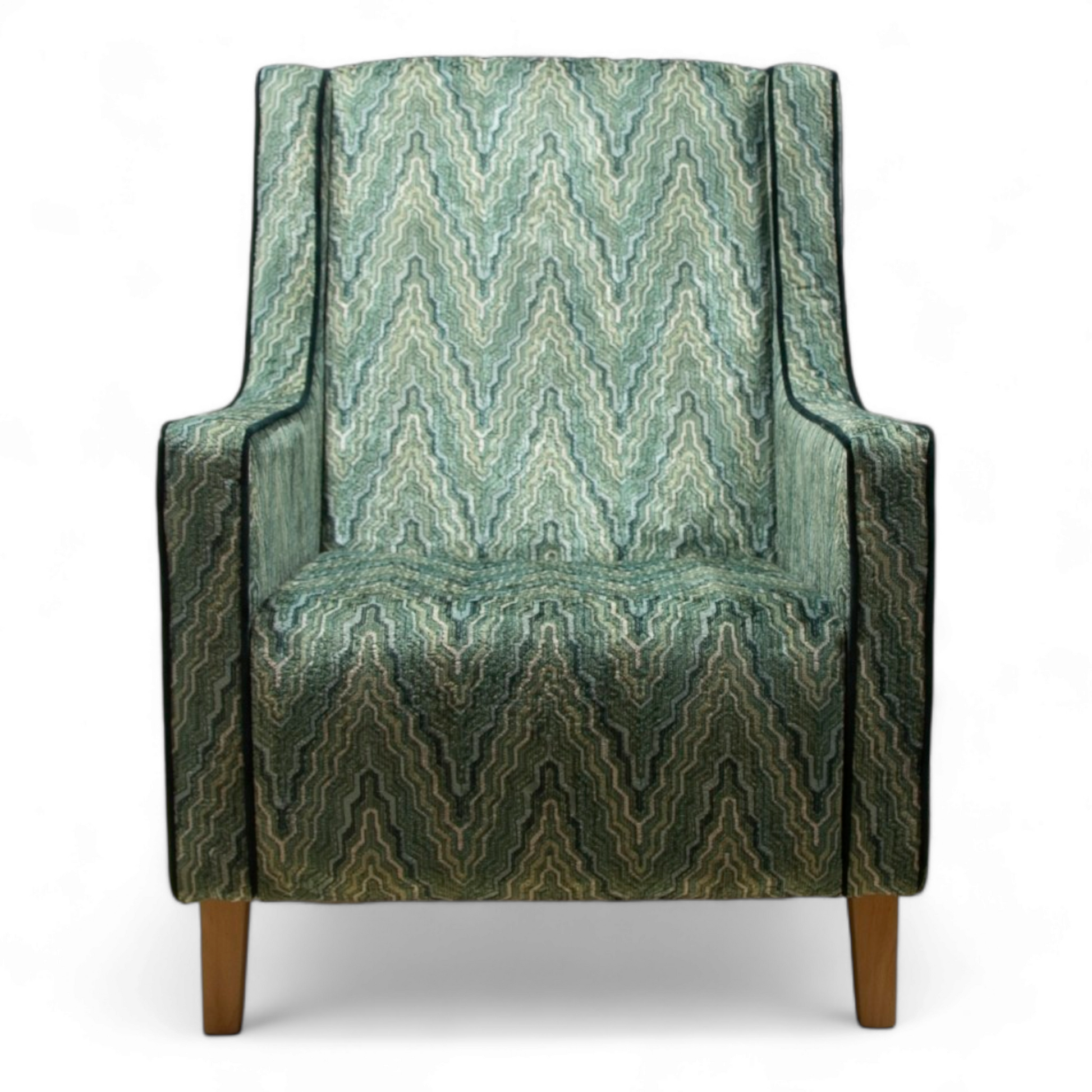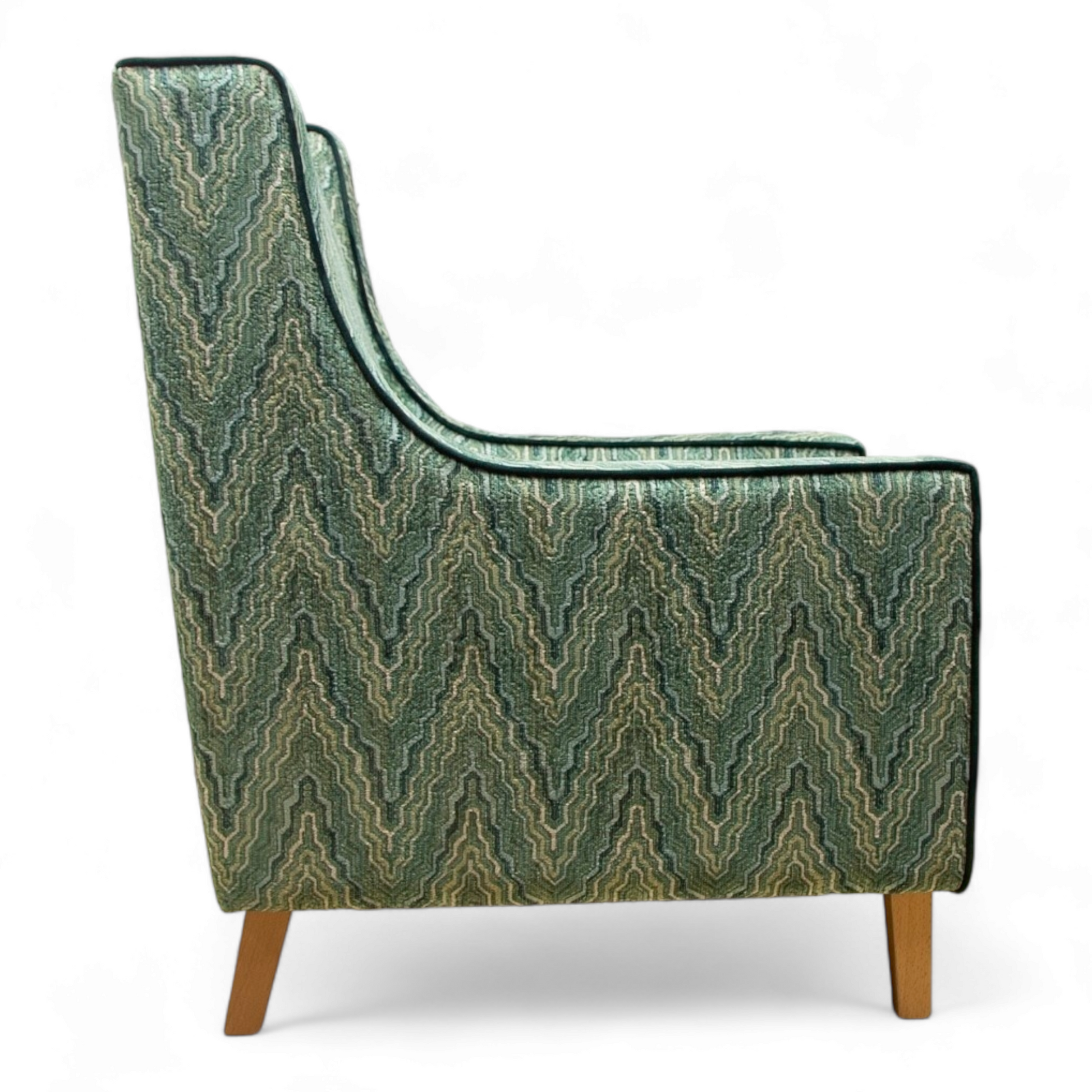 - Upholstered in green patterned fabric with dark green contrasting piping on the curved arms